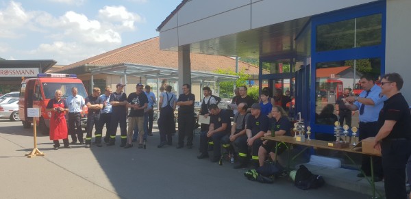 (v. l. n. r. Kreisfeuerwehrinspekteur Udo Schmeiser; Bürgermeister Christoph Lothschütz, Stv. Wehrleiter Stefan Reichhart, Ortsbürgermeister Prof. Jürgen Schneider; Stv. Wehrführer Benjamin Renno; Hauptfeuerwehrmann (HFM) Felix Edinger, Oberfeuerwehrfrau Mareike Weingart, HFM Yannik Veeser, HFM Philipp Zimmer, HFM Davide Stagno, HFM Marco Metzger, HFM Eric Dammer, HFM Sascha Kaiser, HFM Jonas Turos, HFM Pascal Böhnlein, Oberfeuerwehrmann Christian Patton und Wehrführer Marcel Roth)